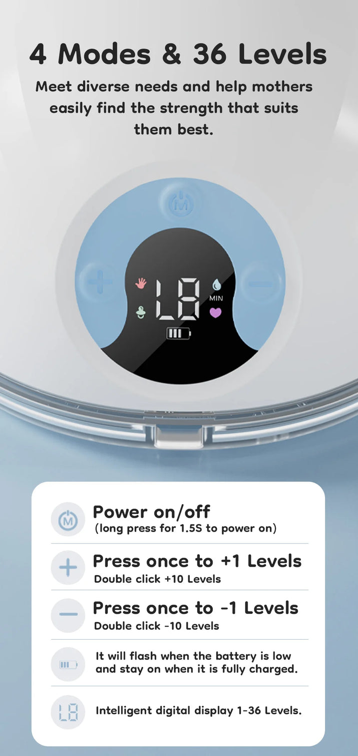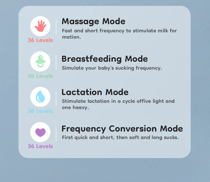 Answer 1: The breast pump features four modes: lactation mode, sucking mode, frequency conversion mode, and normal sucking mode. Each mode offers 36 adjustable levels to customize your pumping experience according to your comfort and needs.
